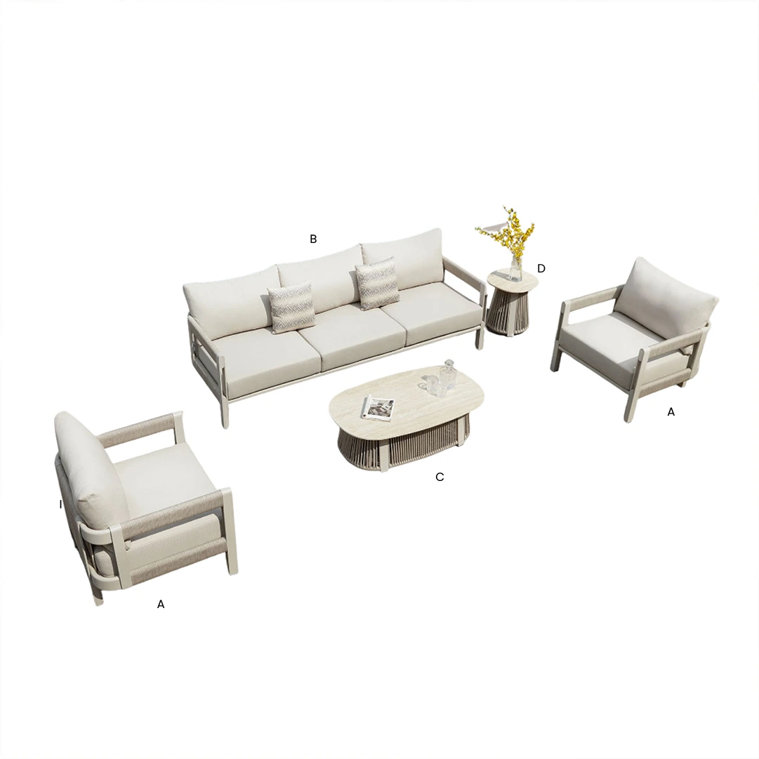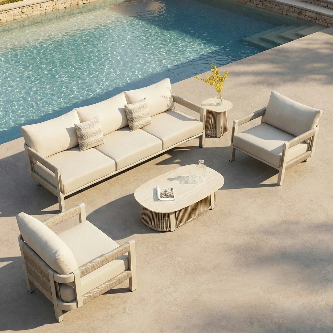 Las mesas presentan cubiertas de piedra sinterizada y bases envueltas en cuerda, unificando